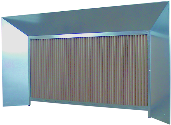 Trockenspritzwand aus verzinktem Stahlblech mit geschweißtem Grundrahmen, Karton-Labyrinthfilter als Vorfilter und Glasfaserfilter als Nachfiltereinheit. Ex-Ventilator inkl. Drosselklappe links angebaut.