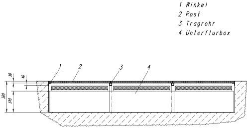 Unterflursystem mit Labyrinthfilter als Vorfilter und Glasfaserfiltermatten als Nachfiltereinheit.