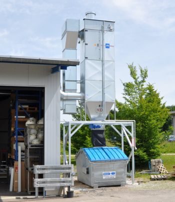 Die Späne und Stäube werden im Unterdrucksystem in die Filteranlage eingesaugt und im Vorabscheidesystem über eine Zellenradschleuse drucklos in den untergestellten Mulden-Container entsorgt.