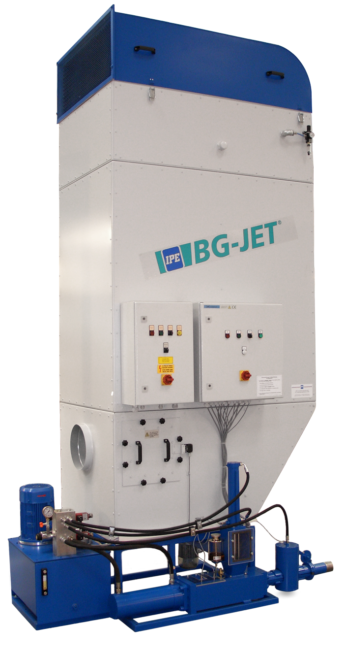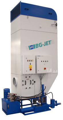 BG-JET-Anlagen sind auch mit untergebauter Brikettpresse für die Außenaufstellung geeignet. Hierzu sind entsprechende Wetterschutzeinrichtungen (Wetterschutzschrank für die Brikettpresse und Wetterschutzdach für die Filteranlage) verfügbar. Die gefilterte Luft kann bei Außenaufstellung über einen Rückluftkanal wieder in den Arbeitsraum zurückgeführt werden.
